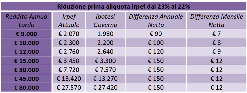 Il sindacato confederale ha effettuato delle simulazioni per misurare il possibile impatto sulle tasche dei contribuenti di entrambe le rimodulazioni IRPEF considerate dal Governo, ossia la riduzione delle aliquote oppure il taglio di un punto percentuale limitato al primo scaglione di reddito, che passerebbe quindi dal 23% al  2.