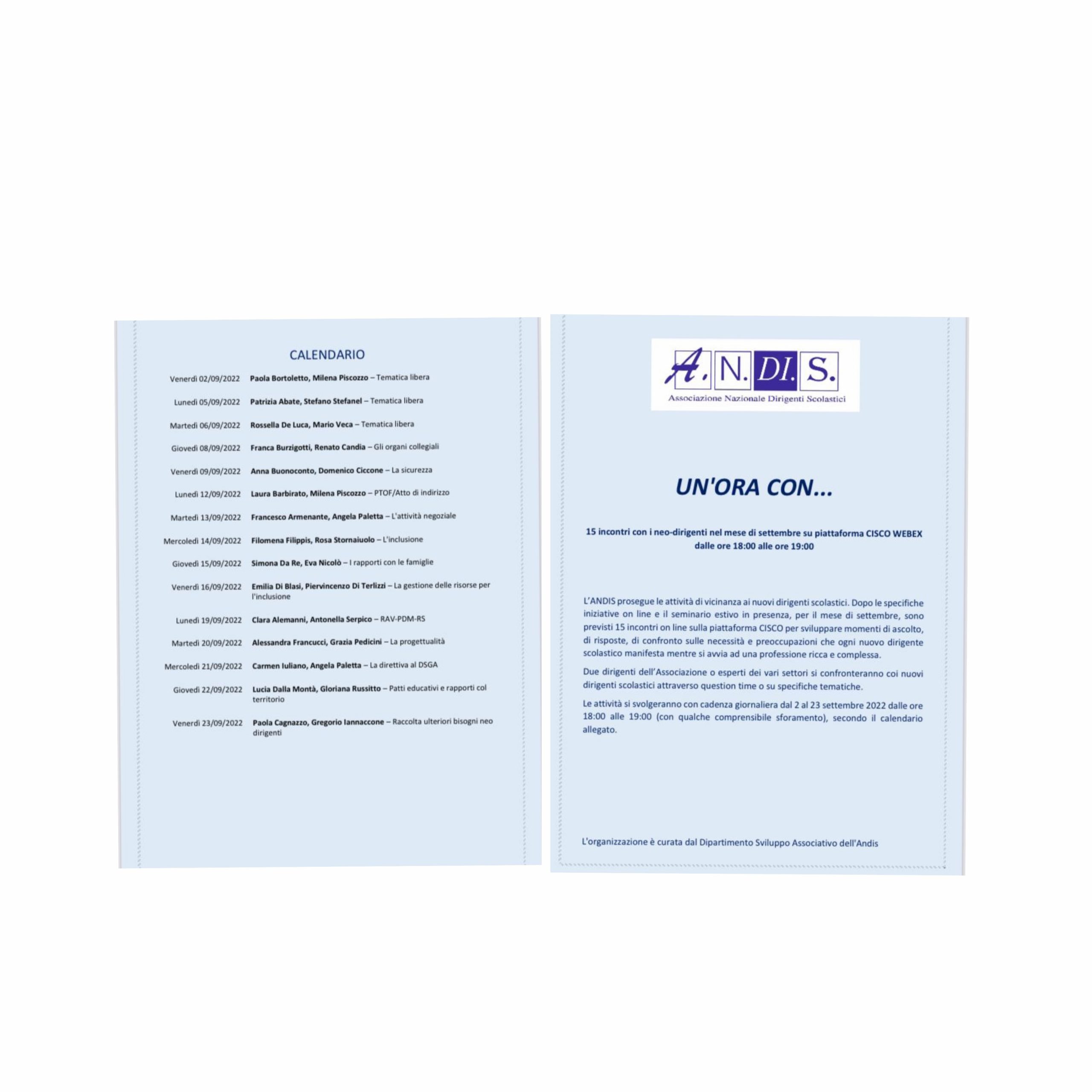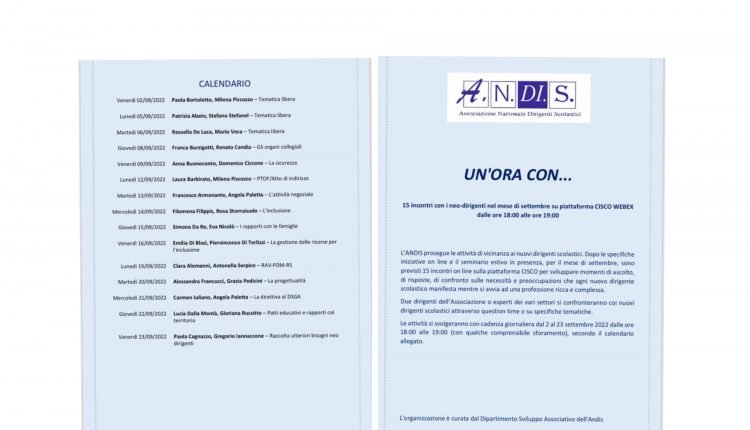 Il Dipartimento Sviluppo Associativo dell’ANDIS sulla scia del Seminario estivo in presenza, che per numero di partecipanti e per l’importanza delle tematiche trattate riscosse non pochi consensi e apprezzamenti, ha inteso proseguire l’attività di vicinanza ai nuovi Dirigenti Scolastici e ha organizzato “UN’ORA CON …” per il mese di settembre p.v., n. 15 incontri on line su piattaforma CISCO WEBEX, dalle ore 18.00 alle ore 19.00, per sviluppare “momenti di ascolto, di risposte, di confronto sulle necessità e preoccupazioni che ogni nuovo Dirigente Scolastico manifesta mentre si avvia ad una professione ricca e complessa”. Due Dirigenti dell’Associazione o esperti dei vari settori si confronteranno coi nuovi Dirigenti Scolastici attraverso question time o su specifiche tematiche. Le attività si svolgono con cadenza giornaliera dal 2 al 23 settembre 2022 secondo il seguente calendario: