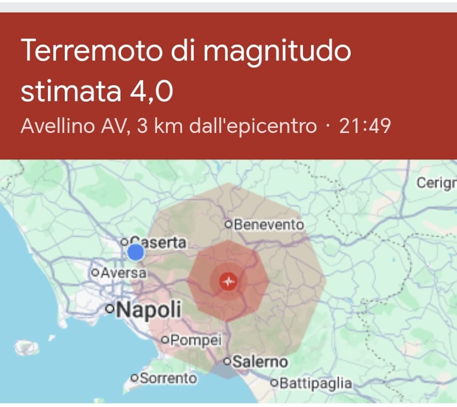 CASERTA- Ore 21.49, avvertita forte scossa di magnitudo tra i 3,9 e 4,4 della scala Richter con epicentro a circa 3 km da Avellino, a Montefredane. Il terremoto è stato sentito in tutta la Campania, dalla provincia di Napoli a quelle di Salerno, Benevento e Caserta, generando il panico tra i cittadini. Si attendono ulteriori aggiornamenti.