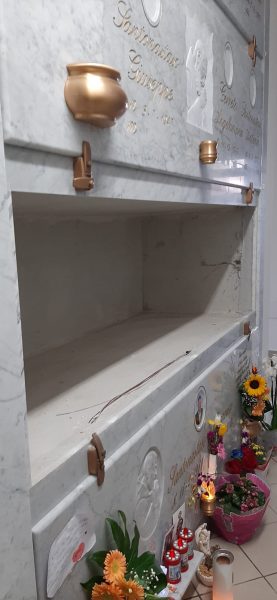 La lapide del loculo che aveva acquistato qualche anno fa, come si vede dalle foto, non c’era più. Il loculo 18B era vuoto e la lapide mancante era corredata da portafiori e portalampada in ottone.