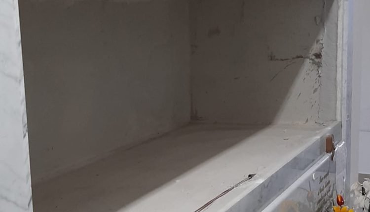 La lapide del loculo che aveva acquistato qualche anno fa, come si vede dalle foto, non c’era più. Il loculo 18B era vuoto e la lapide mancante era corredata da portafiori e portalampada in ottone.