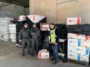 Bloccato il mezzo per sottoporlo ad un accurato controllo, all’interno venivano rivenuti numerosi scatoloni di tabacchi lavorati di contrabbando. La perquisizione veniva quindi estesa al deposito dove, occultati dietro pesanti balle di indumenti usati compresse meccanicamente, venivano individuati ulteriori scatoloni di sigarette.