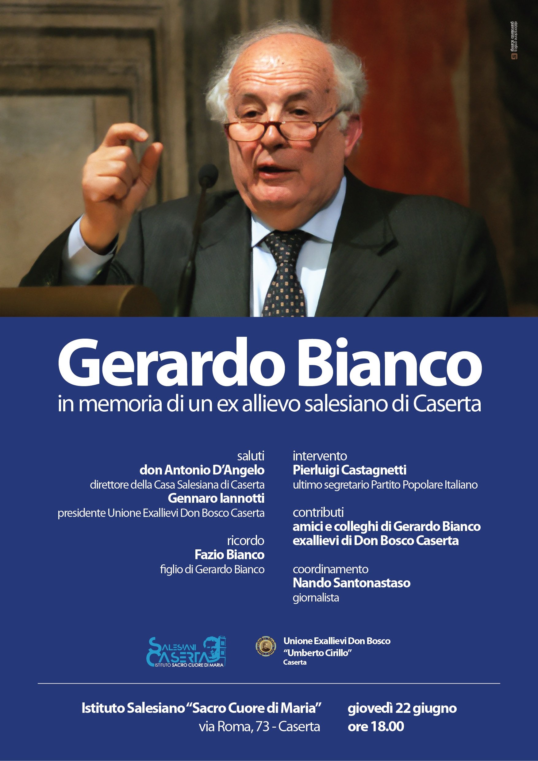 Dopo i saluti del direttore della casa, don Antonio D’Angelo, e del presidente dell’Unione Exallievi, Gennaro Iannotti, il ricordo del politico casertano sarà affidato al figlio, Fazio Bianco, ed all’ultimo segretario del Partito Popolare Italiano, Pierluigi Castagnetti. A questi si aggiungeranno le memorie personali di amici e colleghi di Gerardo Bianco ed exallievi della casa salesiana di Caserta. A moderare l’incontro il giornalista Nando Santonastaso.