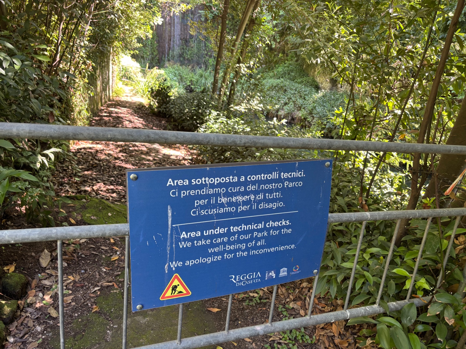 L’incuria e l’abbandono si manifesta anche osservando i cartelli: da anni è posizionato un avviso che segnala “Area sottoposta a controlli tecnici. Ci prendiamo cura del nostro Parco per il benessere di tutti. Ci scusiamo per il disagio”: i lavori sono fermi e l’area è inibita ai visitatori.