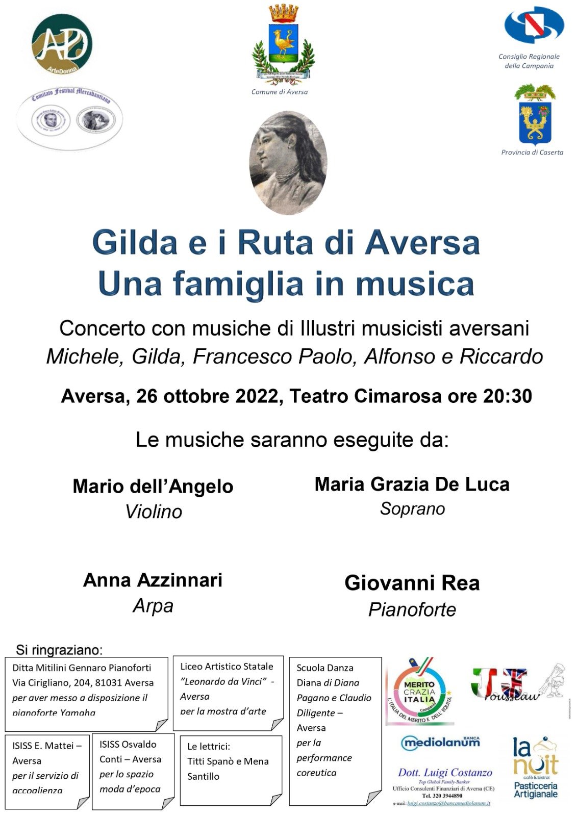 Il 26 ottobre 2022, alle ore 20:30 ad Aversa, nella suggestiva cornice del Teatro Cimarosa, si terrà un concerto in memoria di Gilda e i Ruta, famiglia di musicisti aversani.