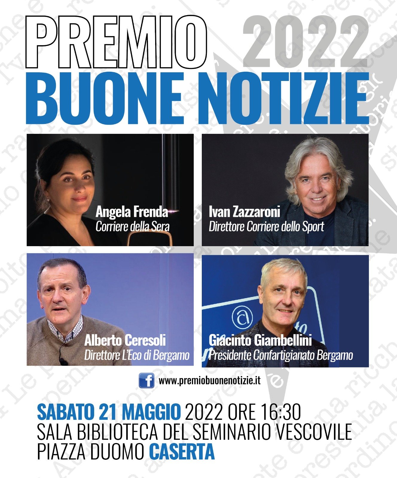 Ivan Zazzaroni, Angela Frenda e Alberto Ceresoli riceveranno il premio Buone notizie nella manifestazione che si terrà sabato 21 maggio prossimo, alle 16:30, nella biblioteca del seminario di Caserta in piazza Duomo, in occasione della Giornata mondiale delle Comunicazioni sociali.