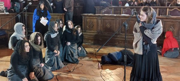 La scena si apre con il monologo intenso di Ecuba (Maria Grazia Vitale IVE) che si rivolge al coro delle donne Troiane vedove e destinate a diventare schiave dei Greci.
