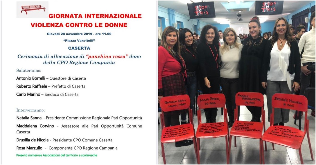 Rappresentare il dolore delle donne attraverso simbolismi. Un modo di contrastare, anche in maniera tangibile, questa autentica piaga sociale che è la violenza contro le donne. E proprio in tale ottica, in occasione della GIORNATA INTERNAZIONALE DELLA VIOLENZA CONTRO LE DONNE, la commissione Pari Opportunità della Regione Campania allocherà una “panchina rossa” in piazza Vanvitelli a Caserta. La cerimonia, espressione di un “dono”, come detto,  dal forte simbolismo, ci sarà domani Giovedì 28 novembre 2019, alle ore 11.00.