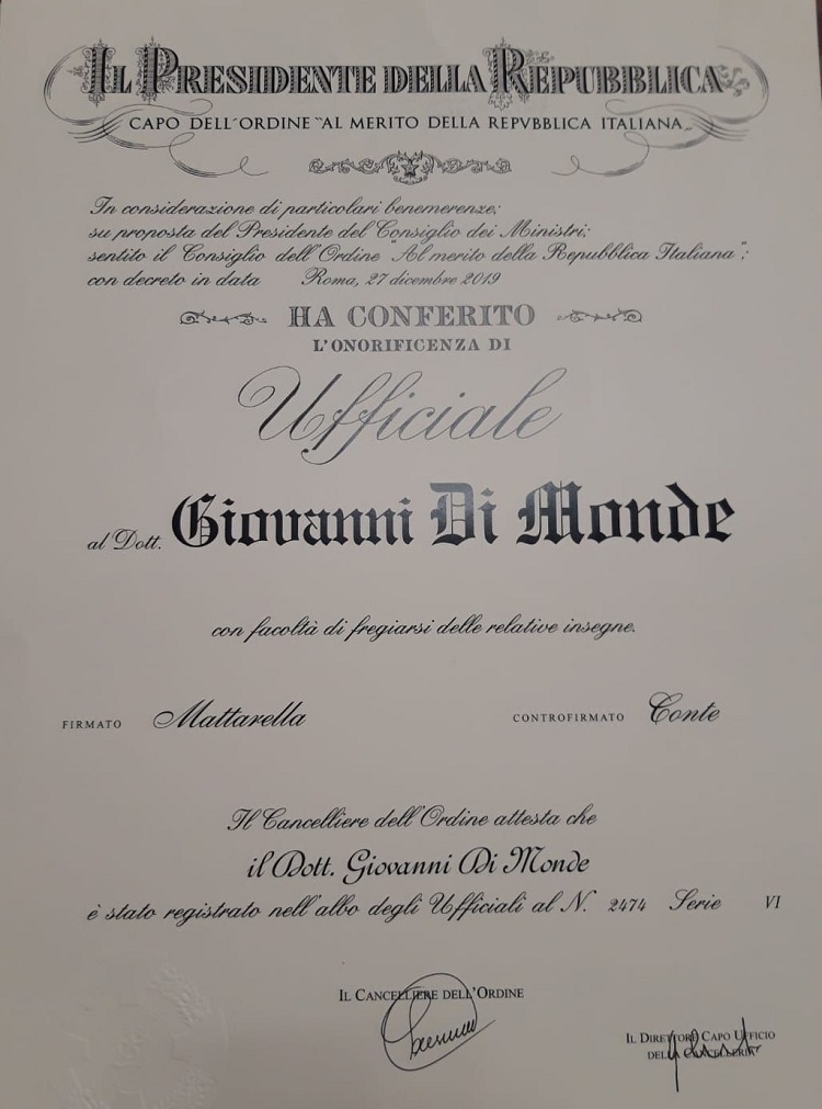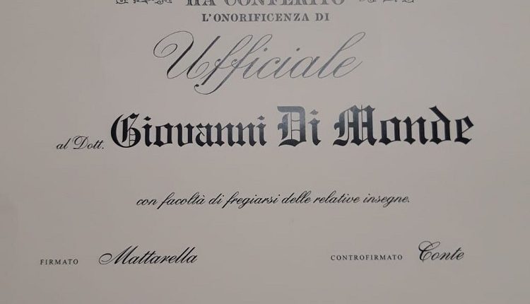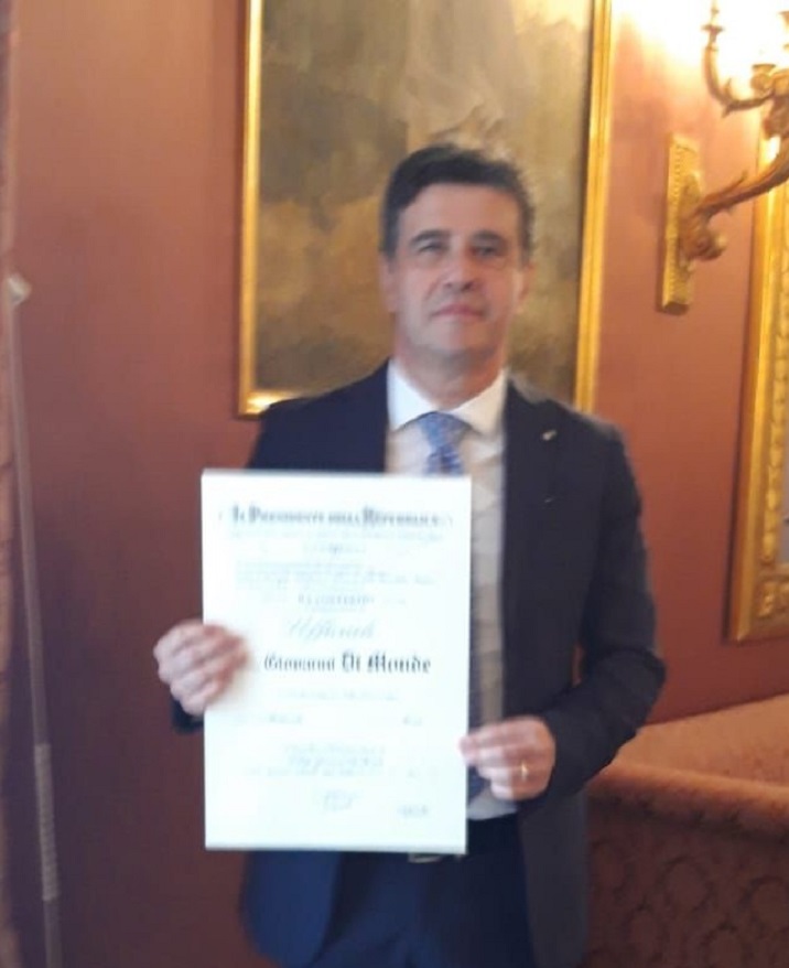 Giovanni Di Monde nominato dal Presidente Mattarella Ufficiale al Merito della Repubblica Italiana