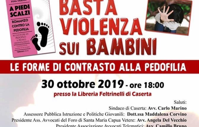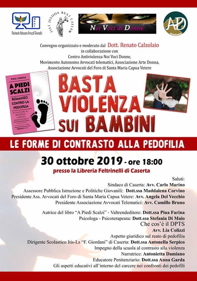 Il giorno 30 ottobre 2019 alle ore 18 la libreria Feltrinelli di Caserta ospiterà un convegno organizzato e moderato dal Dott. Renato Calzolaio e per l’occasione c’è la presentazione del libro “A Piedi Scalzi” romanzo contro la Pedofilia di Pina Farina. In collaborazione con il Centro Antiviolenza “Noi voci di donne”, con il “Movimento Autonomi Avvocati Telematici”, l’Associazione “Arte Donna” e l’Associazione “Avvocati del Foro di Santa Maria Capua Vetere”.