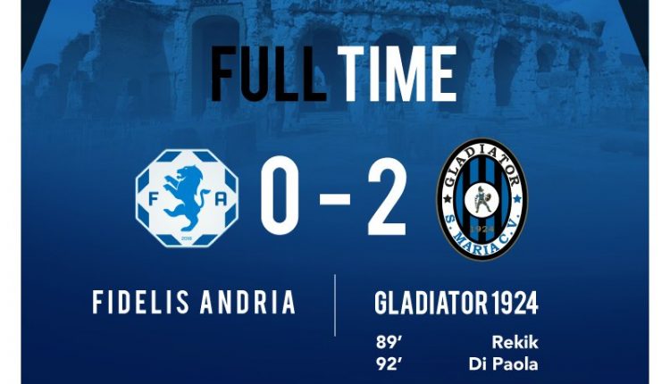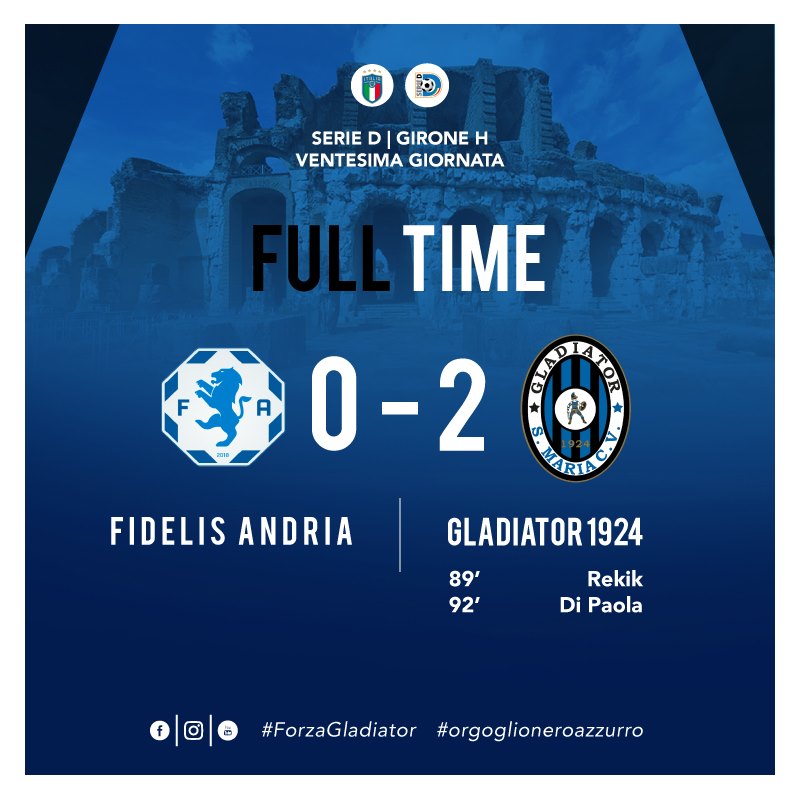 Impresa del Gladiator in terra pugliese, la squadra di mister Borrelli espugna il Degli Ulivi di Andria. Una vittoria che permette di salire la squadra sammaritana al 10 posto in classifica. Fatali per i pugliesi gli ultimi 8 minuti del match, il primo gol arriva alla soglia del minuti finali. Al 88’ arriva il vantaggio con la firma di Rekic, che sfrutta una dormita della difesa e porta in vantaggio il Gladiator. Come se non bastasse la difesa pugliese per cercare il goal del pari, si addormenta anche in occasione del secondo gol di Di Paola che chiude così la partita.