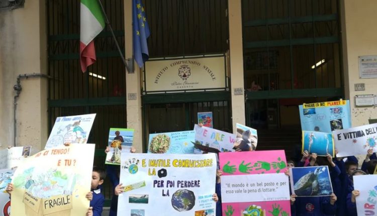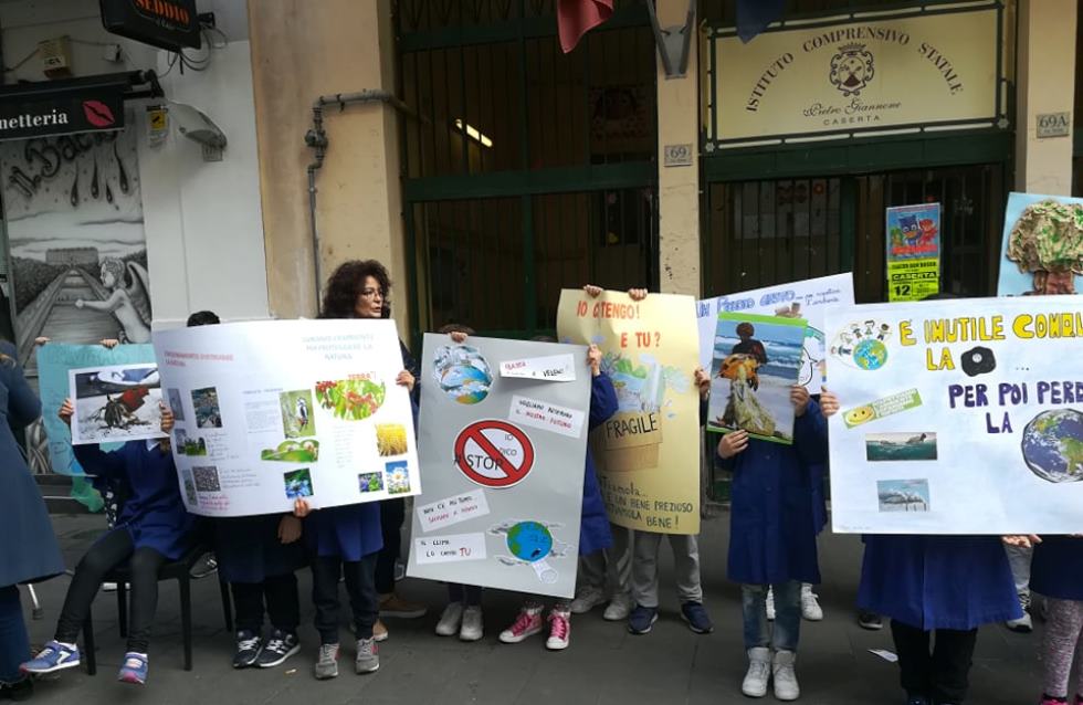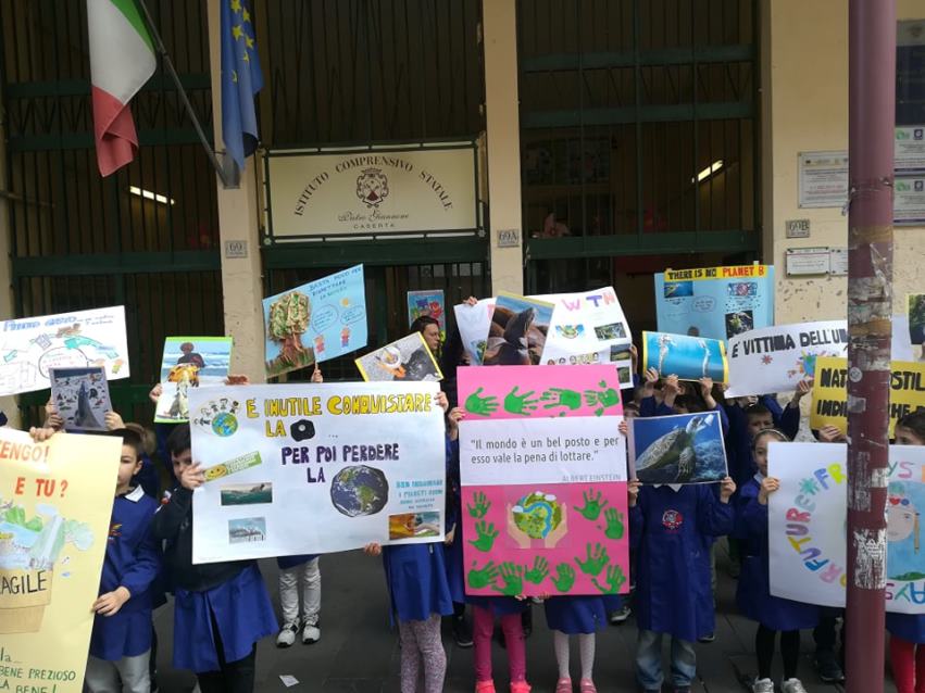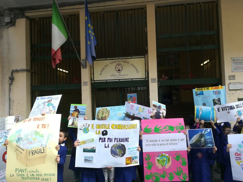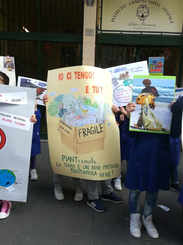 Per il secondo venerdì di maggio 2019, dopo quello del 3 u.s., gli alunni della scuola primaria dell’Istituto Comprensivo Statale “Pietro Giannone” sita in Via Roma a Caserta, di cui è Dirigente Scolastico la dr.ssa Maria BIANCO, anche oggi, venerdì 10 maggio 2019, sono scesi in strada per sollevare l’attenzione sul cambiamento climatico nell’ambito del progetto: “Ambiente – Vita – Futuro”. Le insegnanti del plesso di Via Roma più impegnate ed attive sono: Stefania ZACCARIA, Giusy RAUCCI, Angela MORELLI, Mimma BOVE.