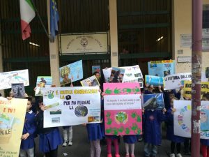 Seguendo l’esempio di Greta Thunberg, la giovanissima attivista svedese che dal 20 agosto 2018 si è messa ogni venerdì in sciopero scolastico, seduta vicino al parlamento svedese, armata solo di cartelli, per sollevare l‘attenzione sul cambiamento climatico, anche le classi usciranno a turno dalla scuola per posizionarsi sul marciapiede alle ore 10:15 e rientrano in classe alle ore 10:30.