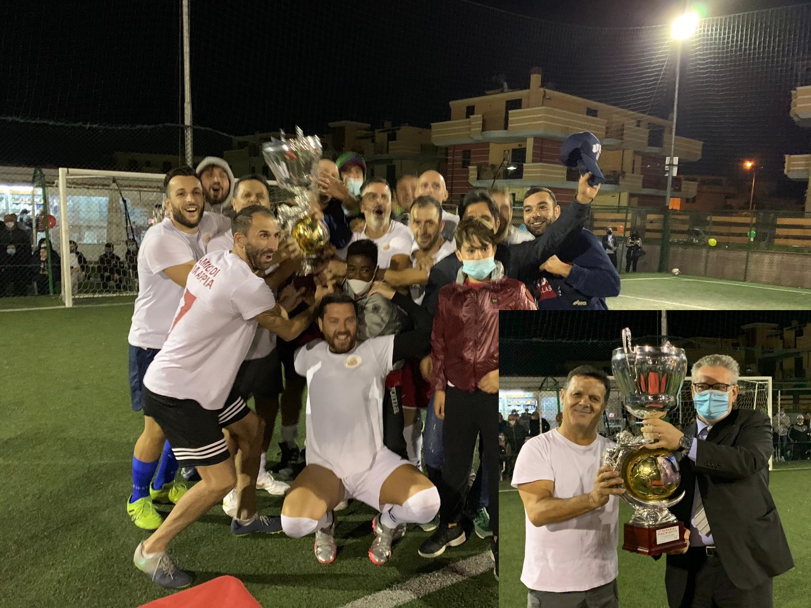 Una serata commovente, ricca di emozioni, che ha mescolato lacrime e sorrisi, ricordi ed esultazioni, sport ed amicizia sui campi ASD Calatia. Una finale entusiasmante sotto l’aspetto sportivo ed emotivo quella disputatasi ieri sera per il primo memorial organizzato da Antonio Mirotto in ricordo della sorella Pina, scomparsa prematuramente, è stata disputata fino all’ultimo goal dalle 2 squadre in campo. Solo ai rigori sono riusciti a conquistare il titolo “Gli amici di via Appia” capitanati dal veterano del torneo Pasquale Giordano. L’ onore delle armi a “Fotografare oggi” capeggiati da Ciro Vinciguerra, cugino di Pina e noto fotografo maddalonese.