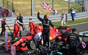 L’anglo caraibico sub iudice sarà anche penalizzato di 10 secondi per la ‘speronata’ al rivale del mondiale (pena soft, giusta non giusta, ci si potrebbe sbizzarrire) tuttavia la fuga della Ferrari finisce a due giri dalla fine. Nonostante la penalità il pilota sulla freccia nera Mercedes n. 44 inanella negli ultimi 13 giri una serie di giri veloci impressionanti che lo proiettano dalla terza posizione dopo il valzer dei pit stop all’inseguimento del ferrarista che ce la mette tutta per tentare la fuga e riportare la rossa sul gradino più alto del podio ma non ce la fa. A due giri dalla fine ancora un sorpasso di forza dell’anglo caraibico che approfitta di un leggero sovrasterzo della Ferrari che va quasi fuori pista, la freccia nera Mercedes nel giro d’onore sbandiera davanti ad un pubblico in visibilio (140.000 spettatori) la bandiera inglese nelle mani di Lewis Hamilton che manda un messaggio chiaro,  non ha nessuna intenzione di lasciare ad altri la corona di campione del mondo.