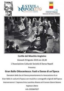 NAPOLI – Per la rassegna Estate a Napoli, il comune di Napoli, associazione cultura e turismo, in collaborazione con l’Associazione Culturale Società di danza Napoli presenta il “Gran Ballo Ottocentesco: fasti e danze di un’epoca”. L’evento si terrà giovedì 29 agosto 2019 alle 20, 30 nel cortile del Maschio Angioino a Napoli.