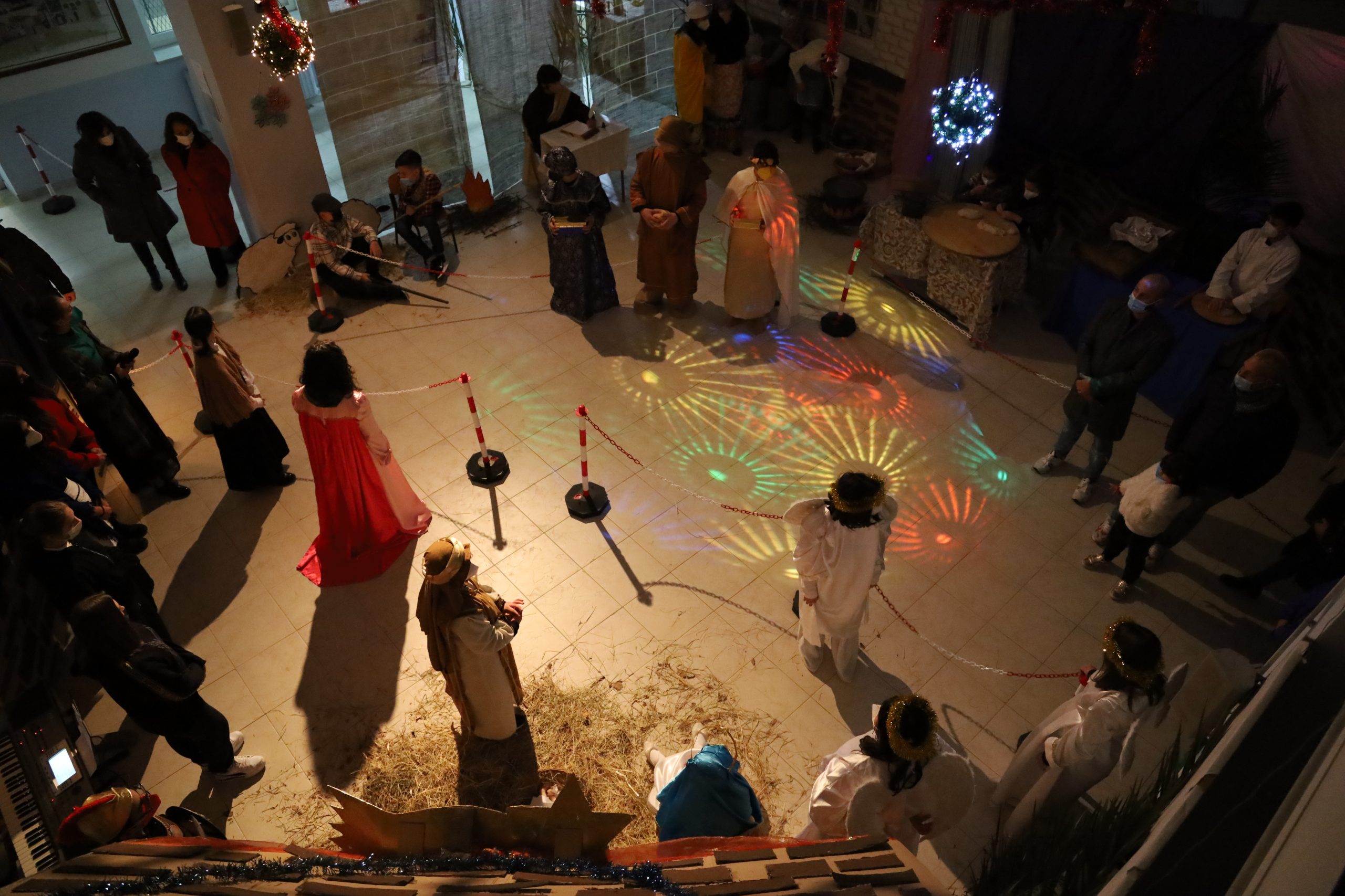 I visitatori hanno visitato il presepe attraverso un percorso che si è sviluppato nell’ampio atrio dell’edificio scolastico dove erano dislocati i vari personaggi tipici del presepe del ‘700 napoletano. Le voci dei ragazzi in sottofondo hanno raccontato l’evento più famoso e sconvolgente della storia dell’umanità, conducendo i visitatori fino alla grotta, dove i piccoli attori hanno alternato dialoghi e canti della tradizione.