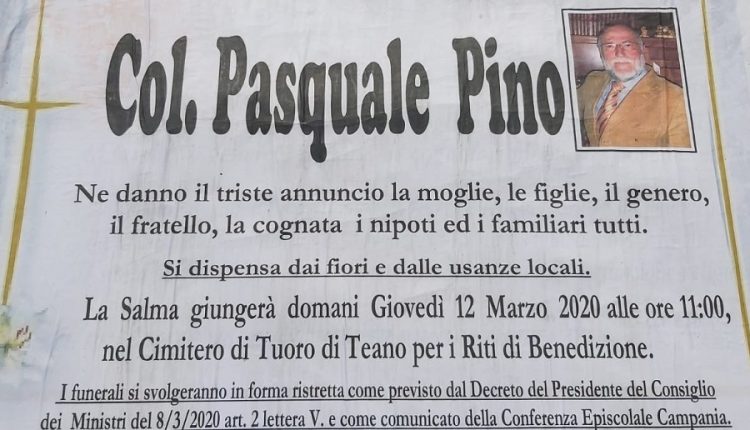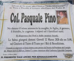 Nato a Teano (CE), il prossimo 28 marzo 1948 avrebbe compiuto 72 anni. Pasquale Pino fu già assessore e consigliere comunale nella città sidicina e Presidente provinciale dell’Associazione Nazionale Bersaglieri di Caserta. I funerali si svolgeranno in forma ristretta, giovedì 12 marzo 2020 alle ore 11:00, nel Cimitero di Tuoro di Teano per i Riti di Benedizione.
