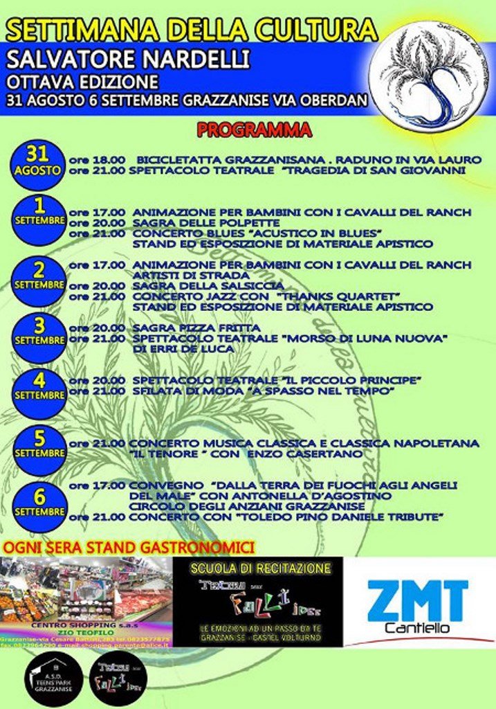 . Infatti stasera, alle ore 21, l’opera sarà replicata in Via Oberdan e sono agevolmente pronosticabili nuovi e scroscianti applausi. A seguire e preceduti da animazioni per bambini e da sagre (delle polpette, della salsiccia e della pizza fritta), vi saranno, da domani a lunedì, due appuntamenti musicali – “Acustico in blues” (1° settembre) e il concerto jazz del “Thanks Quartet” (2 settembre) – ed uno spettacolo teatrale derivato dal “Morso di luna nuova. Racconto per voci in tre stanze” di Erri De Luca (3 settembre). E qui non a caso dobbiamo soffermarci un attimo per evidenziare, benché in breve, la significativa sostanza proposta dal libro del grande scrittore napoletano: “Napoli, estate del ’43, il cielo non appartiene più alla città, ma ai bombardieri alleati. A luglio il fascismo collassa; in agosto le truppe alleate si avvicinano e a Napoli s’incattivisce l’occupazione tedesca; a settembre la resa dell’esercito italiano, rastrellamenti e deportazioni di uomini: la città sta nella tenaglia di due eserciti, uno dentro e uno fuori. Qui si svolge la vita di nove persone in quell’estate. Età, mestieri e storie differenti, compresse in un assedio, rompono le distanze tra loro e vanno insieme, prima al passo, poi fino al galoppo. La macchina della storia maggiore si chiude a sacco sulle vite individuali, ma ci sono sussulti in cui le singole esistenze spezzano la camicia di forza e inventano la libertà”. Basti questa sintesi, inquietante eppur rassicurante, a ribadire l’attenzione particolare che il “Morso di luna nuova” merita. Martedì 4 settembre si proseguirà con lo spettacolo “Il piccolo principe” e la sfilata di moda “A spasso nel tempo”. Mercoledì 5 il tenore Enzo Casertano terrà il concerto di musica lirica e canzoni classiche napoletane, mentre giovedì 6, essendo stato annullato il convegno con la scrittrice-regista Antonella D’Agostino, rimarrà, per la conclusione della “Settimana”, soltanto il concerto “Toledo Pino Daniele Tribute”. Bisogna riconoscere che anche nel corrente 2018 l’offerta culturale predisposta dalla Teen’s Park è abbastanza interessante e perciò stimola la partecipazione