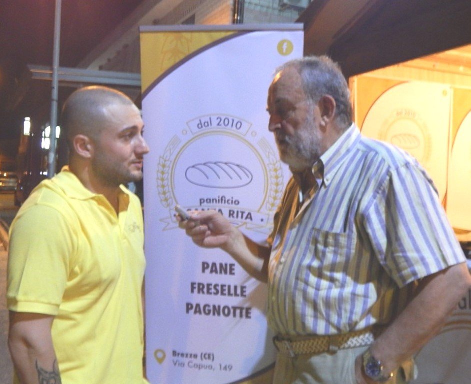 . Siamo approdati così alla prima “stazione espositiva”, quella del panificio Santa Rita, e là ci siamo soffermati. Iniziale assaggio di pane fragrante ancora caldo e subito una breve intervista al giovane titolare Biagio Mezzero. -Un parere su questa 1^ Festa… “Certamente è un’iniziativa molto sentita in zona. Come prima volta, va abbastanza bene!”. -Da quanti anni è attivo il Santa Rita? “Noi siamo nati nel 2010, ma siamo orgogliosi di una vasta clientela che preferisce il nostro prodotto in un raggio di almeno trenta chilometri e che comprende Caserta, Santa Maria Capua Vetere, spingendosi fino a Maddaloni ”. -Su quali tecniche fa leva soprattutto il vostro sistema di panificazione? “Principalmente sul naturale e tradizionale lievito-madre e su otto-dieci ore di lievitazione. Così il pane si mantiene per due-tre giorni e più, rimanendo sempre morbido”. -Dove reperite la materia prima? “Parliamo di farina tipo 00 che in prevalenza acquistiamo a Bellona ”. -Non sarebbe più opportuno incentivare la coltivazione del frumento in questo territorio, così da controllare fin dall’inizio la filiera? “Sì, qui manca la produzione del grano. Sarebbe un’ottima idea riprendere a coltivarlo. Già alcuni anni fa pensavo ad un unico marchio che comprendesse un’intesa complessiva anche con il mondo dell’agricoltura e fra tutti i panifici che operano a Brezza. Finora la difficoltà è venuta dagli interessi particolari di ciascun produttore; invece io penso che sarebbe una soluzione molto importante”. -Si sa che i gusci di nocciole sono un combustibile naturale ed ecosostenibile. Ma c’è qualche altra ragione per cui li preferite? “Certo. Bruciano rapidamente, mantengono la stessa temperatura interna al forno e danno al pane un sapore particolare e gradevole”. -I vostri prodotti e le relative pezzature. “Abbiamo pagnotte da uno e due chili, però realizziamo anche pezzi da 250 e 500 grammi, freselle e pizze casarecce”. Idee chiare e vera passione imprenditoriale nelle parole di Biagio pronunciate davanti ad uno stand elegantemente allestito, accogliente e raggiunto da molti che, oltre alla libera degustazione, ricevevano pure del pane in dono da portare a casa. Purtroppo nella prima delle due serate s’è avuta la defezione di alcuni panifici, sulle cui cause circolavano differenti versioni. In proposito la stessa Amministrazione comunale, co-organizzatrice dell’evento, è rimasta abbottonata. Stasera, tuttavia, si replica e si attende anche una maggiore partecipazione di pubblico. Ci sarà tempo per discutere, capire, approfondire e magari potenziare l’organizzazione per l’avvenire. Oggi è ancora Festa