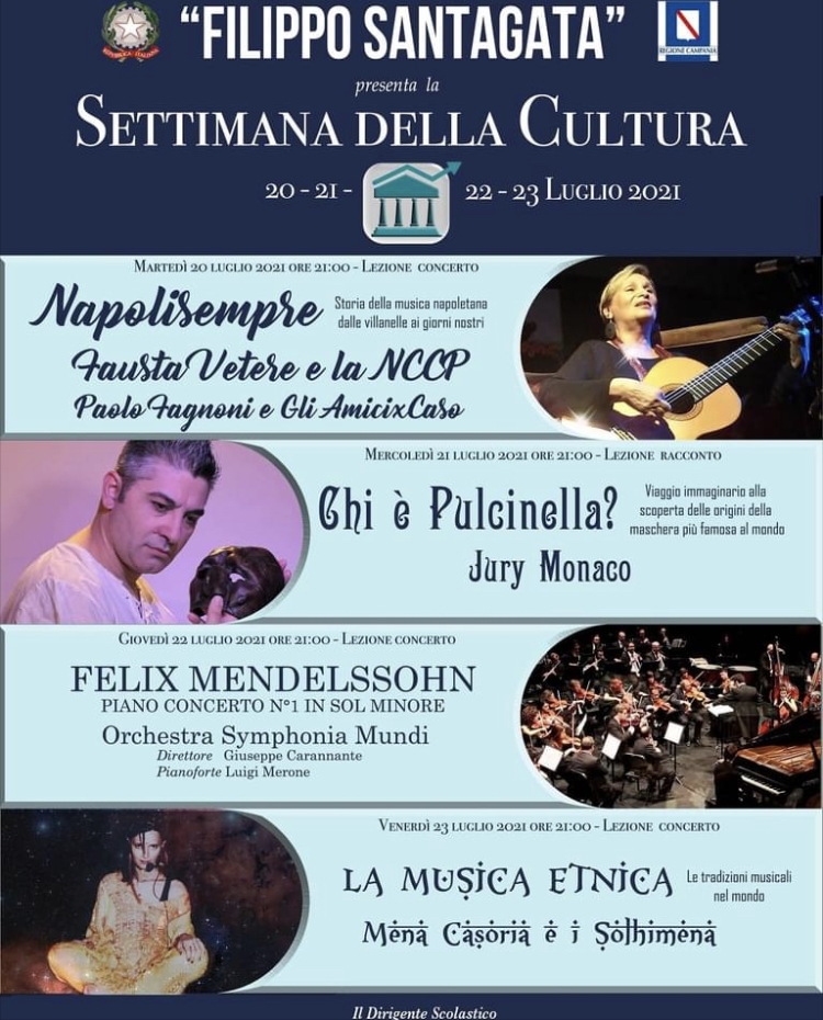 L’Istituto comprensivo “F. Santagata” di Gricignano di Aversa, guidato dalla dirigente Dott.ssa Loredana Russo, dal 20 al 23 luglio p.v., presenta “La settimana della cultura”; la rassegna, patrocinata dal Comune di Gricignano di Aversa, nasce da un’idea della progettista prof.ssa Anna de Simone, in collaborazione con il maestro Vincenzo Anoldo, direttore artistico della manifestazione,nell’ambito del Piano Scuola Estate 2021.