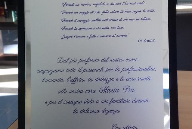 Dal più profondo del nostro cuore ringraziamo tutto il personale per la professionalità, l’umanità, l’affetto, la dolcezza e le cure rivolte alla nostra cara Maria Pia, e per il sostegno dato a noi familiari durante la dolorosa degenza. Con affetto”.