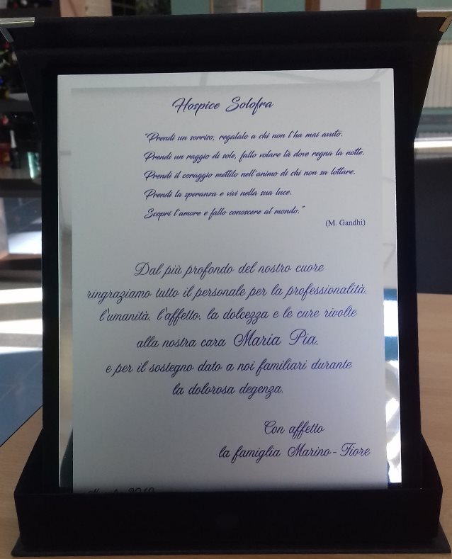 L’Hospice di Solofra, i cui servizi sono gestiti dalla Cooperativa Lavoro per la Salute e dalla Casa di Cura Sant’Anna, rappresenta un’efficiente e adeguata risposta terapeutica e assistenziale, in forma integrata, alle esigenze dei pazienti affetti da patologie progressive e in fase avanzata, con particolare attenzione anche alle necessità dei rispettivi familiari, rispettando e garantendo, quanto più è possibile, le loro abitudini di vita. I medici dell’azienda sanitaria irpina e gli operatori della cooperativa e della casa di cura hanno ricevuto una nuova targa sulla quale sono incise toccanti frasi di sincera riconoscenza per le cure e l’accoglienza fornite alla paziente Maria Pia nel corso della sua degenza.