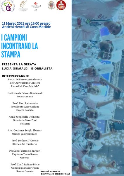 Saranno presenti i campioni, rappresentati dai prof. Chef Carmelo Barberi e Stefano Pista rispettivamente Capitano e General Manager del Team Senior Caserta, il prof. Pino Raimondo Presidente Associazione Cuochi Caserta, Anna Zeppetella Del Sesto fiduciaria Slow Food Volturno, l’ avv. Gourmet Sergio Sbarra critico gastronomico, il prof. Stefano D’Alterio storico del territorio.