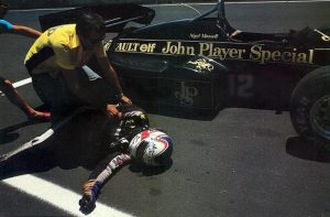 Lo storico svenimento di Nigel Mansell sul circuito di Phoenix in America, davanti ad un pubblico esterefatto e basito generosissimo anche troppo il leone inglese appiedato a pochi metri dal traguardo scende dalla vettura e prova a sospingerla sino alla linea del traguardo distante non più di un centinaio di metri svenendo dalla fatica ed accusando un malore un gesto eroico del pilota british che non voleva abbandonare il suo cavallo nero (sempre la Lotus), che lo ha di fatto appiedato e disarcionato.
