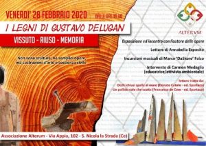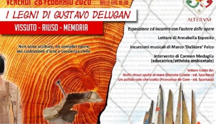 “VISSUTO – RIUSO - MEMORIA – LEGNI di Gustavo Delugan”, è una mostra che si terrà presso l’Associazione “ALTERUM” (Via Appia nr. 102) venerdì 28 febbraio 2020 a partire dalle ore 18:00. Si tratta di una collezione di lavori in legno di recupero con temi contemporanei che saranno il fulcro dell’evento