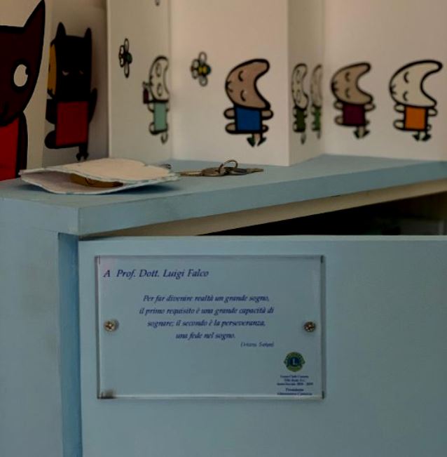 Una targa, sulla libreria ricorda il motto tanto caro al dottore Falco e che accompagnava ogni sua azione: “Per far divenire realtà un grande sogno il primo requisito è una grande capacità di sognare; il secondo è la perseveranza, una fede nel sogno”. Alla cerimonia hanno partecipato anche la moglie del compianto medico ed i figli Pietro e Paolo Falco.