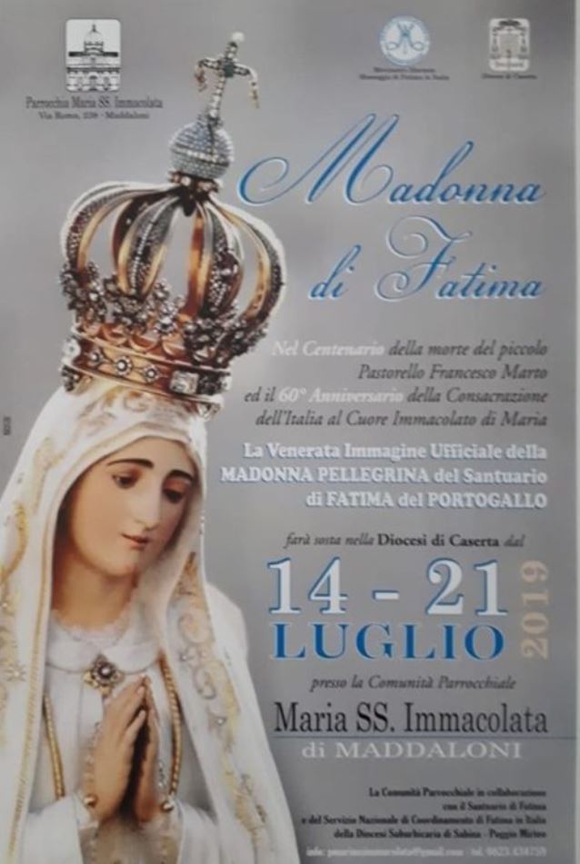 La Città di Maddaloni dal 14 al 21 luglio 2019 ospiterà la venerata immagine della Vergine pellegrina ufficiale del santuario di Fatima (Portogallo). La Santa effige sarà nella chiesa Maria Santissima Immacolata, in via Roma, detta de’ Cappuccini.