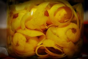 Mettete a macerare le bucce in un contenitore di vetro a chiusura ermetica insieme all’alcool; riponetelo in un luogo fresco e buio per 21 giorni, scuotendolo di tanto in tanto.