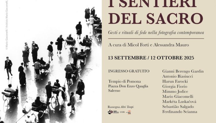 Unitamente all’esposizione, la rassegna Altri Tempi, realizzata da Tempi Moderni con Salerno Letteratura Fuori Festival, apre un nuovo spazio di riflessione e scoperta. Sviluppa un percorso condiviso al di fuori dei tracciati più battuti, ma che custodisce nel suo cuore la stessa tensione creativa e intellettuale che anima tanto I Racconti del Contemporaneo che il Festival di Salerno Letteratura fin dalla loro nascita. Di questa esperienza resta viva la matrice originaria: la passione per le trasversalità culturali, la volontà di mettere in dialogo linguaggi diversi dalla parola scritta alla voce, dal pensiero alla visione e l’impegno nel costruire incontri che siano vere e proprie lectio, frutto di uno sguardo appassionato ma sempre fondato su una solida ricerca, su un pensiero che scava, che approfondisce, che lascia traccia. Altri Tempi non è solo una rassegna, ma un gesto collettivo. Una chiamata alla partecipazione. Un laboratorio di senso. Un atto di resistenza culturale. Tra gli ospiti, S.E. Mons. Andrea Bellandi, Clementina Cantillo, Rossella De Martino, Giovanni Fiorentino, Alfonso Amendola, Gennaro Carillo. La mostra fotografica I SENTIERI DEL SACRO è patrocinata da: Regione Campania, Provincia di Salerno, Comune di Salerno, Camera di Commercio di Salerno, Confindustria Salerno, Università degli Studi di Salerno e dalla Curia Arcivescovile di Salerno – Campagna – Acerno.