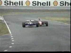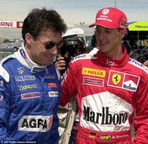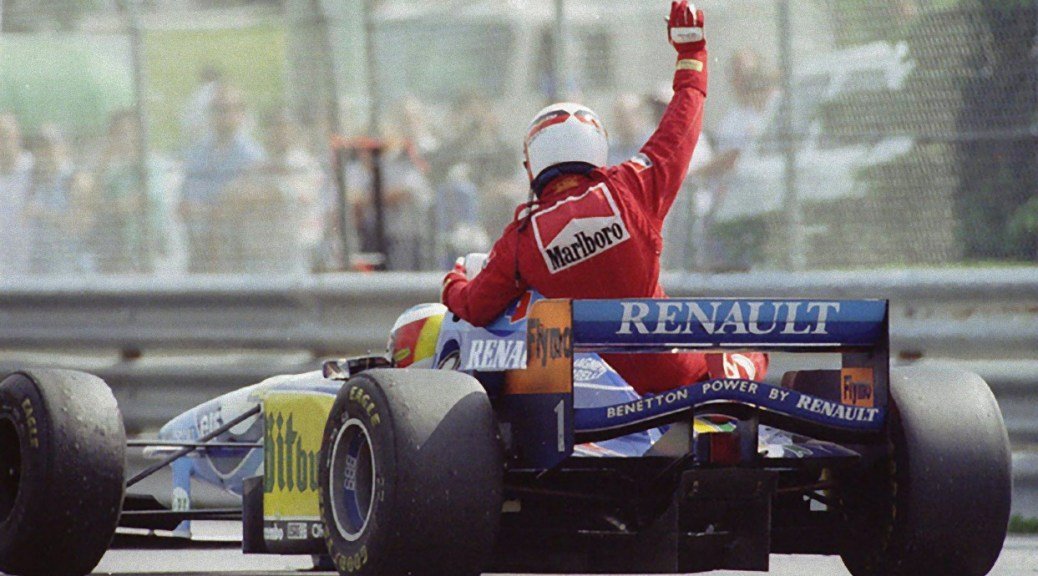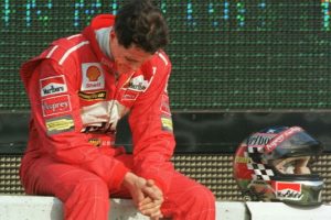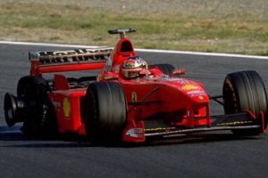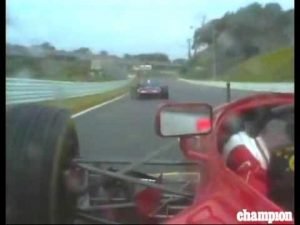 A questo punto la strategia salta l’imperativo è uno attaccare, tutti i dati i i rilievi il lavoro fatto oramai non serve più veloce richiamo del francese ai box cambio gomme slick per lui, che si trasforma in un treno impazzito percorrendo disciplinatamente la traiettoria asciutta proprio come un treno sul binario con la pista che dopo la pioggia iniziale con il passaggio delle monoposto si asciuga giro dopo giro, l’azzardo è premiato Jean Alesì si trasforma in un missile inanella una serie di giri veloci la sua rossa è messa alla frusta a ferro e fuoco giri veloci ad ogni passaggio è sempre la rossa n. 27 ad avere il casco rosso ( giro veloce Jean Alesì, passaggio successivo, giro veloce , Jean Alesi su Ferrari) nonostante un imprevisto un mezzo incidente all’ingresso del rettilineo dopo il triage il franco avignonese su Ferrari risale la china velocemente, sorpasso da urlo a ì Damon Hill di forza ed all’esterno poco prima del curva del triage (il triangolo l’ultima curva prima del rettilineo), insomma per non tirarla troppo a lungo a metà gara Jean Alesi riappare di nuovo negli specchietti retrovisori del battistrada tedesco Schumacher che a quel punto inizia a tirare anche lui dato che il ferrarista lo stava raggiungendo attaccando ad ogni giro, purtroppo però la solita SFIGA proverbiale del francese che non lo lascia si ricorda di lui (la fortuna è cieca si dice, la sfiga spesso si ricorda di Alesì quando lo vede o rivede) la Rossa dal posteriore emette una nuvola bianca leggermente azzurra, il motore è andato, il pilota samurai n. 27 deve accostare nella ghiaia e parcheggiare (forse il troppo sforzo è costato caro alla sua rossa), una gara che poi come detto sarà vinta da Schumacher che porterà a casa il titolo n. 2 su Benetton prima di andare a fine anno in Ferrari indossando anch’egli la tuta rossa.