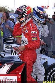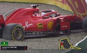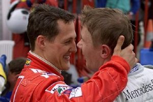 Nell’ultima parte di gara anzi arriva anche la beffa per il tedesco in Ferrari la sua gomma posteriore destra quando era terzo al giro numero trentuno, cede e si schianta di botto anche per il tedesco fermata obbligata nella ghiaia a bordo pista con tutta delusione che traspare sul volto, del campione di Kerpen dopo che si toglierà casco e sottocasco (un copione per certi versi simile a quello di Alesi nel 95 dove la rossa troppo spremuta come un arancia rossa nel senso letterale del termine dal pilota cede appiedando il suo conducente o fantino passateci la metafora).