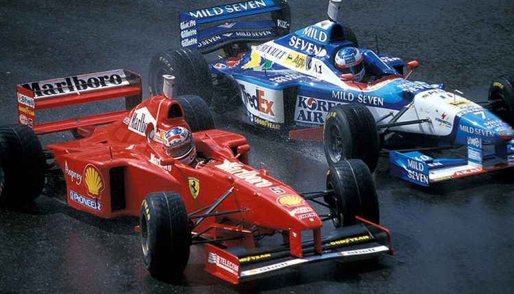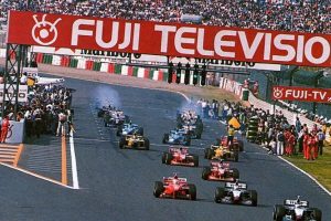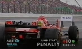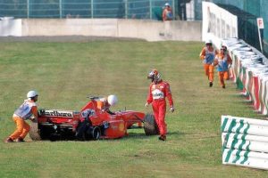 Ma torniamo al 1995, Jean Alesì nel suo ultimo anno in rosso con la sua monoposto n. 27 (l’ultimo numero di G. Villeneuve, l’aviatore che rese leggendario appunto il n. 27 dopo la sua tragica fine a Zolder), ottiene qualche soddisfazione la vettura è competitiva in alcuni tracciati e migliora durante l’anno, in Canada sul circuito G. Villeneuve (coincidenza, destino fate voi….), il franco italiano ottiene la sua prima ed unica vittoria, rimanendo appiedato e facendosi dare uno strappo da Kaieser Schumacher su Benetton che lo accompagnò durante il suo giro d’onore (I due poi a fine annata si scambieranno le vetture, quando dai uno strappo a un collega spesso il tuo ‘passegero prende il tuo posto , accadde anche a Silverstone, annata 1992, Nigel Mansell, d uno ‘strappo’ al nemico amico Senna appiedato dalla sua McLaren biancorossa, qualche anno dopo, il 1994 Senna, va alla Williams dove correrà gli ultimi tre gran premi della sua sfavillante carriera). Ma veniamo a Suzuka 1995 Jean Alesì parte in prinma fila ottimo piazzamento al suo fianco sua maestà il due volte campione del mondo M. Schumacher che proprio in quella gara otterrà la matematica certezza del titolo n. 2 con la squadra tutta italiana della Benetton di Flavio Briatore. La partenza sotto l’acqua è buona Jean Alesì molto abile sul bagnato tiene la sua posizione e ritmo del tedesco senza problemi mantenendosi a 2/3 secondi dal battistrada con vettura grigio azzurra ma arriva la punizione che non ti aspetti per il 27 rosso, 10 secondi penalità per Alesì, dovuti ad una partenza anticipata (Jump Startt) con le monoposto ancora a mò di serpentone la mazzata è enorme infatti, dopo qualche giro Jean Alesi sconta la sua penalità al suo box e riparte nelle retrovie, forse l’innesto all’ultimo secondo della prima necessaria per partire ha causato un piccolo sbalzo avanti della rossa attivando i sensori presenti nell’asfalto che hanno rilevato l’irregolarità.