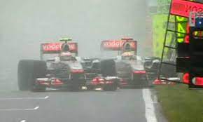 Scontro Button-Hamilton – Si parte per 5 giri dietro la safety car, per motivi di sicurezza visto il maltempo. Al rientro, Alonso attacca Vettel, che difende la prima posizione. Ma il vero protagonista è Hamilton, che qui ha vinto il suo primo GP nel 2007. Prima tenta un sorpasso al limite a Webber, che perde qualche posizione. La manovra finisce sotto investigazione, ma senza esito, anche perché il britannico esagera ancora. Va largo al tornante per provare un sorpasso ambizioso su Rosberg, e soprattutto, all’ottavo giro, dopo il rettilineo d’arrivo cerca di infilarsi dove spazio non c’è. “Che sta facendo?” grida via radio il compagno di squadra Button che prende la traiettoria migliore. Al campione del mondo 2008 non resta che allargarsi troppo e finire la corsa con la posteriore contro le barriere con la posteriore sinistra danneggiata. “Le condizioni erano al limite, ho fatto del mio meglio per tenere la macchina in pista. Credo che in quel momento avevo un buon ritmo, ho cercato di passare Button all’esterno ma continuava a allargarsi all’ultima curva. Non credo che l’abbia fatto apposta a mandarmi fuori, comunque” dice Hamilton. Niki Lauda, però, la vede in maniera molto diversa. “Lewis ha superato tutti i limiti, non puoi guidare così”. Per il team principal Martin Whitmarsh, “sapeva che doveva mettere pressione su Sebastian Vettel e ha commesso un errore. Jenson non sapeva che Hamilton era lì e stava cercando di guadagnare una posizione. Forse qualcuno ci criticherà, ma è così che gestiamo la squadra. Lewis è un pilota straordinario e appassionato, sarebbe un errore per noi frustrare la sua passione”.
