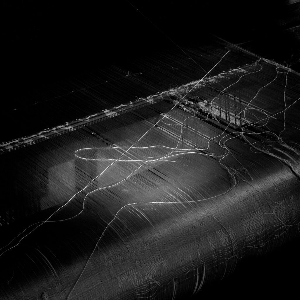 In “ID” il fotografo non si limita a ritrarre la storia; egli ne evoca le forme latenti. Attraverso il suo obiettivo, i telai, gli ingranaggi metallici e i rocchetti del torcitoio abbandonano la loro natura meccanica per diventare protagonisti di una narrazione sospesa. Nel bianco e nero dei suoi scatti la luce non è solo un elemento illuminante, ma un narratore silenzioso che rivela dettagli nascosti nell’ombra. Il lavoro di Biasiucci si concentra sulla materia della Real Colonia, facendo riaffiorare i volti delle donne e gli strumenti del lavoro serico come tracce di un’identità mai perduta.