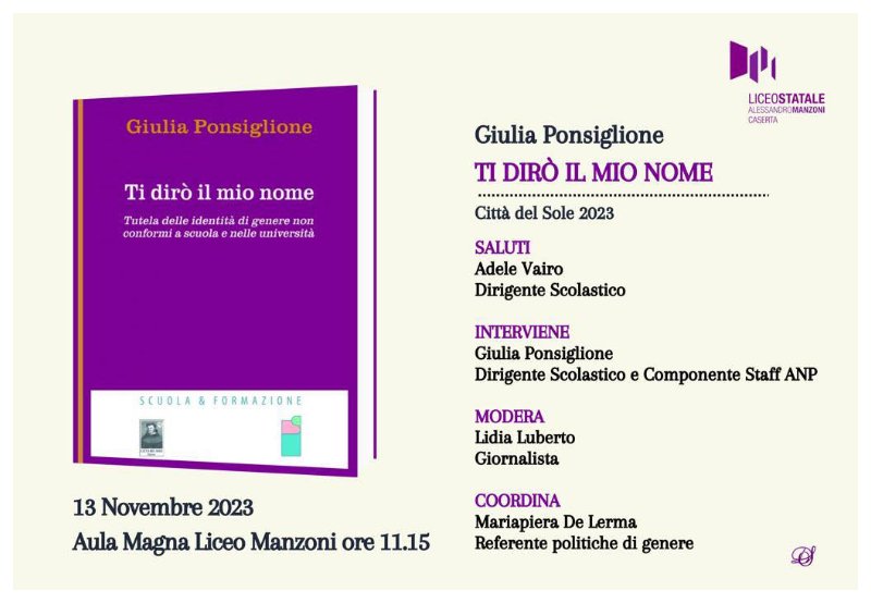In linea con la sua costante dedizione alla promozione della parità di genere, domani, 13 novembre, alle 11:15, nell’Aula Magna, la presentazione del libro “Ti dirò il mio nome: tutele delle identità di genere non conformi a scuola e nelle università” a cura della dottoressa Giulia Ponsiglione, scrittrice, dirigente scolastico e membro dell’associazione nazionale dirigenti pubblici (Anp).
