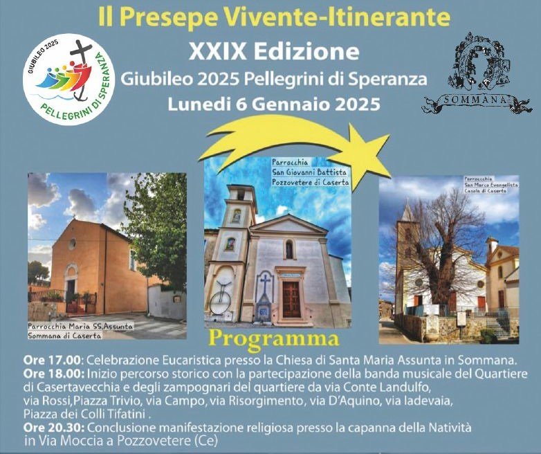 Si rinnova l’appuntamento con il presepe vivente di Casertavecchia. Un presepe vivente itinerante giunto alla ventinovesima edizione, che si ripropone oltre alla rappresentazione religiosa, la riscoperta del territorio e delle sue bellezze nascoste. Questa edizione, a cura del Centro Giovanile ANSPI in collaborazione con la diocesi di Caserta, Don Valentino Picazio e il comune di Caserta, si ripropone di valorizzare il borgo di Sommana. Dal lato liturgico invece l’edizione 2025 dall’emblematico titolo “Giubileo 2025 Pellegrini di Speranza”, affronta un tema attualissimo dedicato all’anno santo, che papa Francesco XVI ha aperto la sera della vigilia dello scorso Natale. La rappresentazione del presepe e le funzioni religiose prenderanno il via dalla chiesa di Santa Maria Assunta in Sommana, alle ore 17.00, con la celebrazione dell’eucarestia. Alle 18.00 a seguito della funzione religiosa, il corteo inizierà il cammino itinerante, accompagnato dagli zampognari del quartiere, che si esibiranno nel cortile dove è nato l’ultimo bambino di Pozzovetere. Accompagnerà la sfilata anche la banda musicale del Quartiere di Casertavecchia. Da via Conte Landulfo, punto di partenza della rappresentazione, i figuranti proseguiranno il loro cammino con le loro performance in via Rossi, piazza Trivio, Via Campo, via Risorgimento, via D’Aquino, via Ladevaia per giungere in piazza Colli Tifatini. Il transito del corteo non è fine a sé stesso, ma oltre alla rappresentazione itinerante del presepe, i visitatori avranno la possibilità di vivere il contatto diretto con gli abitanti della zona, che apriranno gli storici portoni e gli annessi cortili, offrendo agli avventori i prodotti tipici della tradizione dei Colli Tifatini. Il parroco delle comunità di Pozzovetere e di Casola, Don Valentino Picazio, attende i parrocchiani e i turisti non solo per rinnovare il rito del presepe, ma per rafforzare il senso di comunità nello spirito autentico del Natale, spesso relegato a mero consumismo. Gli organizzatori si ripropongono di rinnovare lo spirito religioso della festa coinvolgendo le famiglie. Il loro ritrovarsi intorno al bambinello, racchiude la vera sintesi della rinascita sociale e religiosa e rappresenta quella speranza, che ci ha ricordato Papa Bergoglio nell’apertura della porta santa.