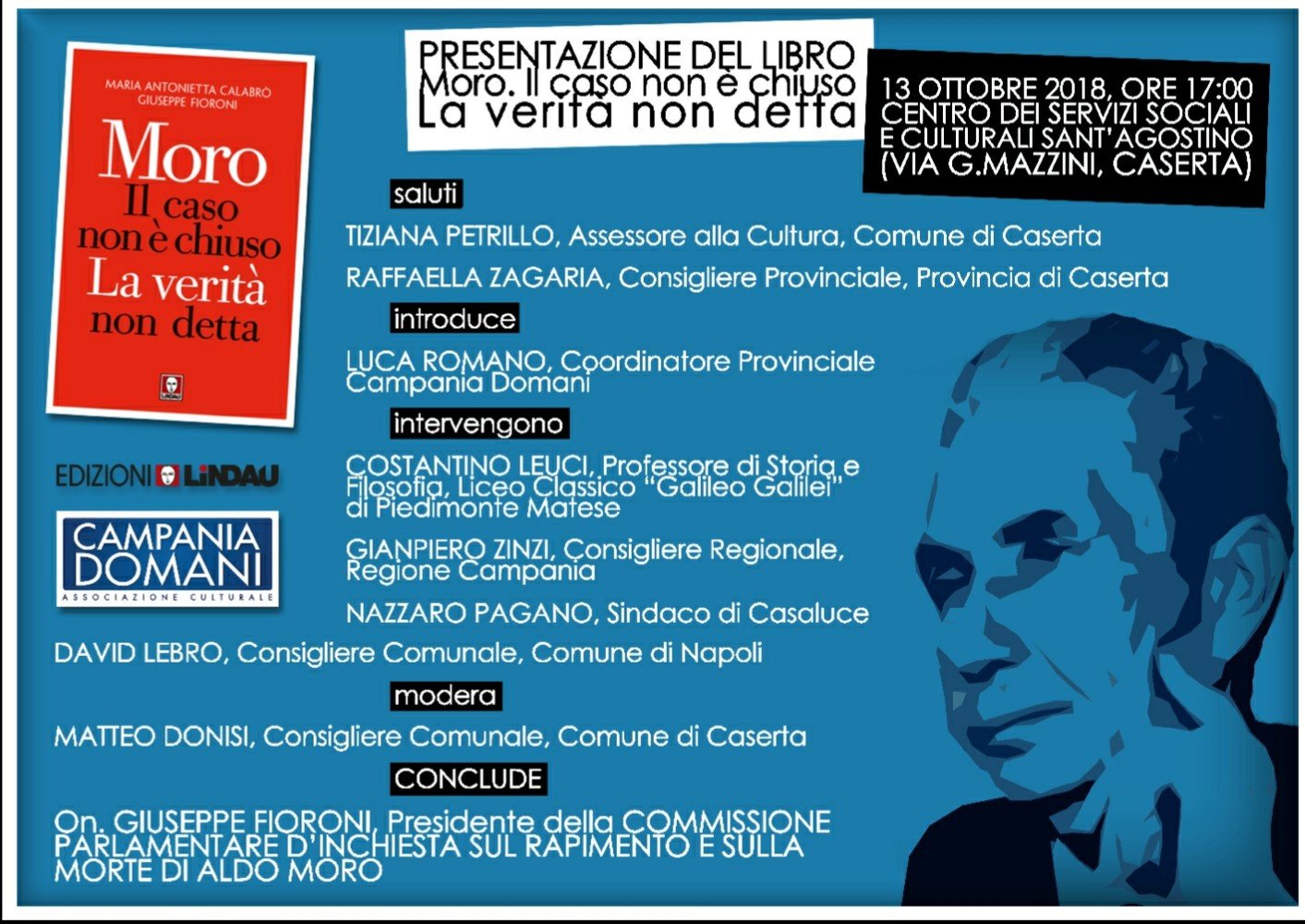 Una presentazione, che ha visto la presenza, oltre che del Ministro Fioroni, del Consigliere regionale Giampiero Zinzi, del Consigliere del comune di Napoli David Lebro, del professore Costantino Leuci, del sindaco di Casaluce Nazzaro Pagano, della consigliera provinciale Raffaella Zagaria e di Luca Romano, coordinatore provinciale Campania Domani. Questi, durante l’incontro moderato dal Consigliere comunale Matteo Donisi, in una sala gremita hanno parlato dell’Italia degli anni ’70, della figura di Aldo Moro, del suo essere “avanti con i tempi”, del suo rapimento, del suo omicidio, delle indagini e delle ricostruzioni conseguenti e della verità.
