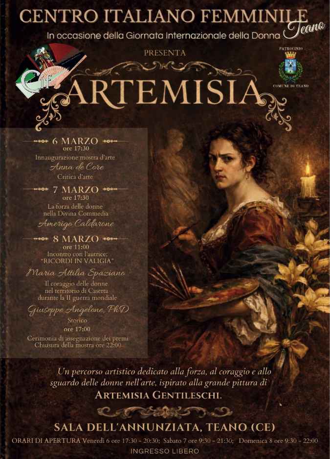 La tre giorni della mostra, dal 6 all’8 Marzo 2026, intitolata ad Artemisia Gentileschi, la grande artista italiana del XVII secolo, è dedicata agli artisti del territorio. In provincia di Caserta, al centro di Teano, nella Sala dell’Annunziata. Ingresso libero. Oltre a poter ammirare varie espressioni dell’arte che esprimano la ricchezza d’animo degli autori nella ricerca del bello, si avrà modo di fare anche altre esperienze interessanti. Sabato 7 marzo, alle ore 17.30, il già professore Americo Caldarone tratterà il tema: “La forza delle donne nella Divina Commedia”, declamando e spiegando quel passo del girone dei lussuriosi, ove tanti adolescenti si turbarono sui banchi di scuola e oggi si turbano nell’incontrare l’amore di Paolo e Francesca descritto dal Sommo Poeta. Nella mattinata dell’8 marzo, dopo la presentazione della sua autobiografia: “Ricordi in valigia” di Maria Attilia Spaziano, lo storico Giuseppe Angelone narrerà il coraggio delle donne nel territorio di Caserta durante la Seconda guerra mondiale.