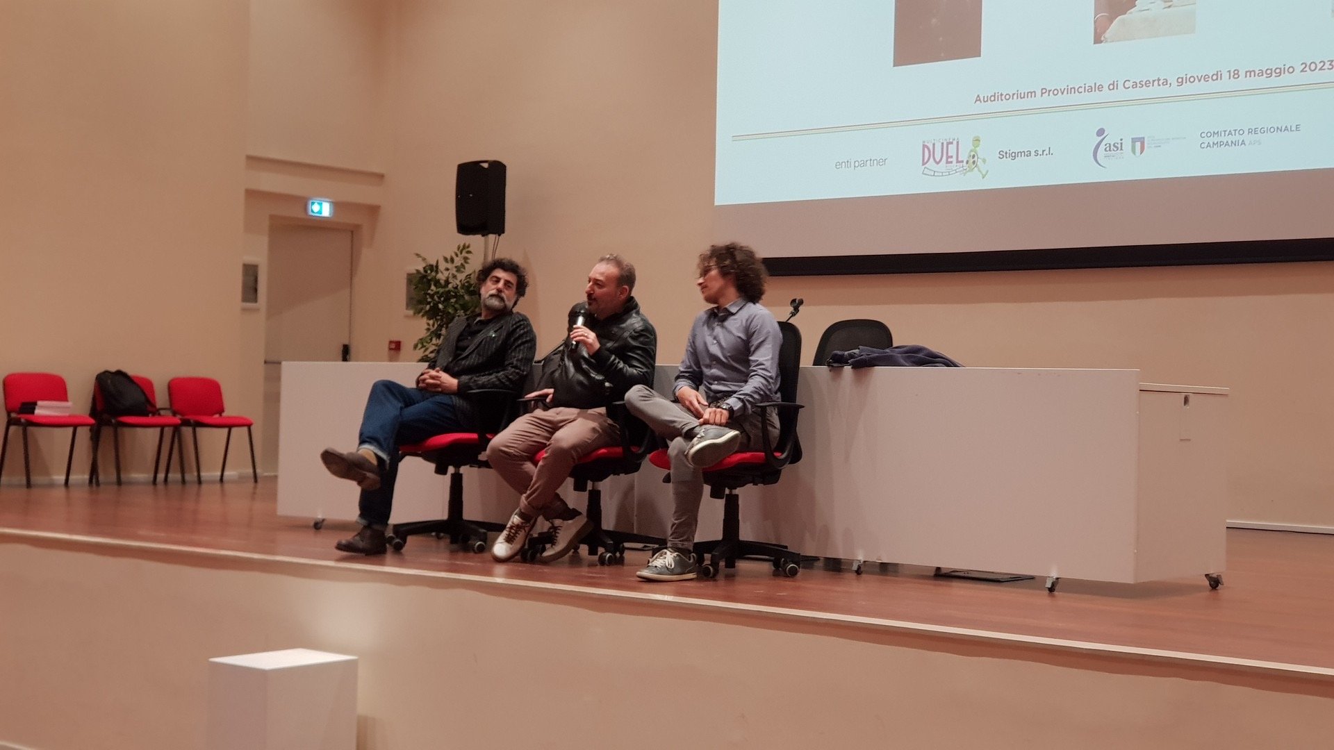 Sul palco, insieme agli artisti, si sono alternati i saluti della dirigente scolastica del Liceo «Giannone», Marina Campanile, e di Silvestro Marino, amministratore della società partner principale del progetto, Sly Production s.r.l., e della Stigma s.r.l.. Accanto a loro sono stati riportati i saluti della dirigente scolastica del Comprensivo «Dante Alighieri», Tania Sassi, e sono intervenuti i responsabili degli ulteriori enti partner del progetto: Nicola Scaringi, presidente del Comitato Regionale Campano di Associazioni Sportive e Sociali Italiane APS, e Giuseppe D’Apice, docente della Università Popolare per lo Sport e il Terzo Settore ASD APS. Ad animare la mattinata con gli studenti il responsabile scientifico del progetto, il giornalista ed esperto di produzione cinematografica Gianrolando Scaringi.