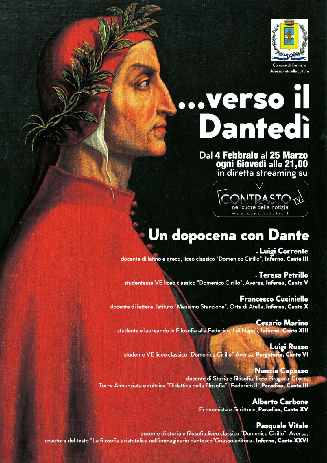 Nell’ambito delle iniziative promosse su tutto il territorio nazionale in vista del Dantedì, il Comune di Carinaro , ,guidato dal sindaco Nicola Affinito, ha promosso un ciclo di letture e di commenti (che saranno trasmesse in streaming da Contrasto TV) di alcuni dei canti più significativi della Commedia, ad opera di docenti e di allievi del liceo classico di Aversa “D. Cirillo e non solo, che, a partire dal 4 febbraio, daranno voce alla lingua immortale di Dante.