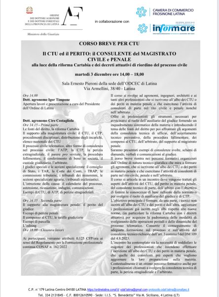 L’Ordine dei Dottori Agronomi e dei Dottori Forestali di Latina, in collaborazione con la Camera di Commercio di Frosinone e Latina e l’Azienda speciale della Camera Informare terrà martedì 3 dicembre dalle ore 14,00 nella prestigiosa sede dell’ODCEC di Latina sala Ernesto Pieroni in via Armellini, 38 Latina, il corso “Il CTU ed il PERITO: il CONSULENTE del MAGISTRATO CIVILE e PENALE, alla luce della riforma Cartabia e dei decreti attuativi di riordino del processo civile” tenuto dal dr. agr. Ciro Costagliola.