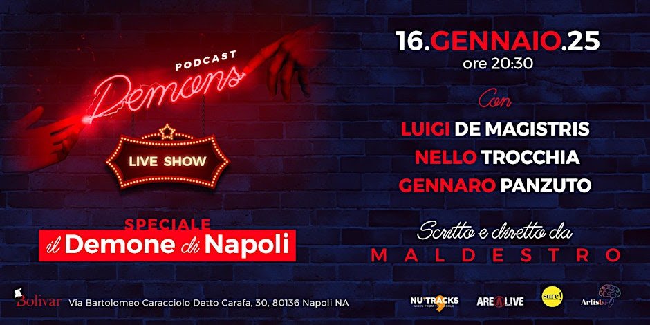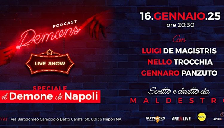 Il 16 gennaio 2025, il Teatro Bolivar di Napoli ospiterà un evento speciale: il Demons Live Show, scritto e diretto da Antonio Prestieri, in arte Maldestro. L’evento, dal titolo “Il Demone di Napoli”, rappresenta l’evoluzione naturale del podcast Demons, progetto che ha conquistato il pubblico con la sua capacità di raccontare storie profonde e stimolare riflessioni senza filtri.