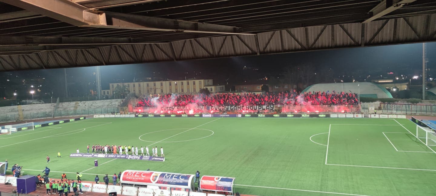 Una Casertana pressochè perfetta ha la meglio nel derby contro gli acerrimi rivali della Salernitana: 1-0, la decide il croato Karlo Butic. I falchetti hanno dominato dall’inizio alla fine sprecando in numerose occasioni il colpo del definitivo KO. Grazie anche ad un “Pinto” quasi esaurito ed inneggiante ai suoi beniamini, i rossoblù hanno ottenuto una vittoria che può significare davvero tanto e che può aprire strade fino ad ieri impraticabili. Coppitelli si affida al collaudato 3-5-2 con De Lucia in porta; Kontek, Bacchetti e Martino in difesa; Oukhadda e Llano come “quinti”; Toscano, Pezzella e Girelli in mediana; Butic e Casarotto come punte. Cosmi schiera un 4-4-1-1 con in porta Donnarumma; Anastasio, Matino, Arena e Berra in difesa; Villa, Tascone, Quirini e Capomaggio a centrocampo; Antenucci a supporto dell’unica punta Lescano. Si vede sin dall’inizio la maggiore aggressività dei rossoblù, che, però, si lasciano prendere dalla troppa foga e sono quindi troppo frettolosi. I primi tiri in porta sono, però, dei granata (4’ Anastasio). Al 9’ Kontek ruba una gran palla a centrocampo, avanza, tira e colpisce il palo. Al 13’ è Quirini a far paura al “Pinto”, ma il calciatore granata ottiene solo un corner. Dopo alcune “occasioncine”, per lo più di marca rossoblù, ecco il 37’. Girelli prova il tiro, che, rimpallato da Matino, finisce a Butic; il croato fa partire un tiro magistrale che Donnarumma può solo osservare infilarsi nell’angolino alto: 1-0, tripudio rossoblù. Ora, infatti, il “Pinto” è una bolgia. Tutti pregustano finalmente una vittoria nel derby, sempre difficile quasi impossibile negli ultimi anni. La riscossa dei falchetti non si ferma qui e al 42’ Oukhadda va vicino al raddoppio. Allo scadere della prima frazione, Antenucci manda alta una punizione. Nella ripresa, la Casertana non perde mordente e, anzi, è ancora più viva e pericolosa. Al 58’ ottima sgroppata di Casarotto sulla destra, la punta la mette in mezzo per Llano, che però tituba troppo e la ripassa a Casarotto, che tira malissimo e se la fa parare da Donnarumma. I tifosi della Casertana ripenseranno all’occasione persa per almeno dieci minuti. Al 65’ altra occasione per Llano sugli sviluppi di un corner, Capomaggio salva in extremis. Ancora più pericolosa l’occasione per Casarotto pochi secondi dopo, quando la punta, a tu per tu con Donnarumma, se la fa parare. La Salernitana è allo sbando, vacilla e sembra più volte sull’orlo del KO. Al 74’ colpo di coda dei granata: Capomaggio per Lescano, che trova la risposta di De Lucia. Al 78’ in una delle sue tante giocate, Llano va via sulla sinistra, la mette al centro e trova la deviazione di Capomaggio con la mano: rigore, confermato anche all’FVS. Llano vuole completare l’opera presentandosi al dischetto, ma se la fa clamorosamente parare da Donnarumma. La Salernitana si butta in avanti e per poco un tiro di Lescano non trova la rete: bravo De Lucia a deviare in angolo (84’). Gli ultimi minuti sono in apnea per i tifosi di casa, anche perché il recupero sarà di otto minuti. Otto lunghissimi minuti che però non fanno altro che rendere più grande l’esplosione di gioia del pubblico del “Pinto” al triplice fischio finale. Vittoria meritata, sudata, goduta. Un plauso a tutta la squadra con allegato staff, bravi anche ad evitare il contraccolpo psicologico dopo la pesante disfatta di Siracusa. Da stasera si può guardare al futuro con speranza, la stessa speranza che il più delle volte è pietra miliare di qualcosa di bello. Al tempo stesso, bisogna continuare a lavorare con umiltà e testa bassa: per quello che tutti stiamo pensando ci vorrebbe il Primario. Avanti così, con passione, dedizione e voglia di fare, gli stessi ingredienti che hanno contraddistinto stasera questa squadra. Credeteci, falchetti. Credeteci e soprattutto provateci!