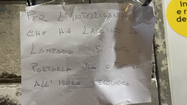 Maddaloni – La maleducazione e la mancanza di rispetto per quello che è il bene comune purtroppo continua a dilagare. E così qualche giorno fa, in pieno centro storico, è apparsa una lampada, una piantana, che qualcuno ha pensato bene di depositare quasi al centro dell’incrocio tra via San Giovanni e via Ponte Carolino. Non sappiamo se il genio della lampada pensasse ad un istallazione di arte contemporanea o semplicemente a depositare un inutile rifiuto senza prendersi la briga di chiamare l’ingombranti o di arrivare all’isola ecologica. Fatto sta che qualche cittadino, che invece di senso civico, e anche di senso dell’umorismo, a pensato bene di affiggere un biglietto di invito sulla lampada che al momento staziona ancora lì nell’incrocio. Ma non illumina nessuno. Avrebbe potuto illuminare la testa di chi ha lasciata lì ma purtroppo a quanto pare è davvero rotta. Seguono le foto.