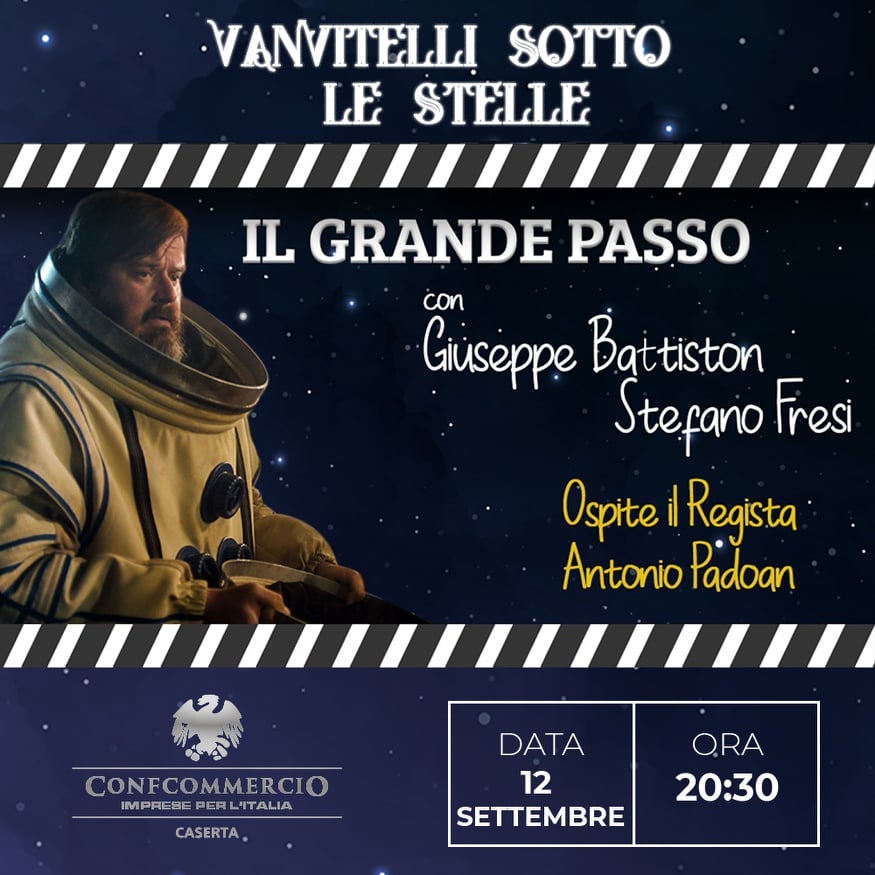Sarà la commedia ‘Il Grande Passo’ di Antonio Padovan interpretata dagli irresistibili Stefano Fresi e Giuseppe Battiston, per la prima volta insieme sullo stesso set, a decretare il gran finale – sabato 12 settembre alle ore 20,30 – della seconda edizione della rassegna cinematografica gratuita all’aperto ‘Vanvitelli sotto le stelle’, promossa da Confcommercio con il patrocinio del Comune di Caserta. Il film, presentato con successo al Torino Film Festival, racconta la storia di due fratelli, caratterialmente molto diversi tra loro, alle prese con una mission impossible che solo la forza dei sogni e il legame familiare potranno, forse, aiutare a compiere. Nel cast anche Flavio Bucci, Roberto Citran e Camilla Filippi. Quello di sabato sarà il settimo e ultimo appuntamento di una rassegna che ha ottenuto un largo consenso di pubblico, facendo registrare ogni settimana il tutto esaurito. Tanti gli artisti – registi, produttori, sceneggiatori, attori – che si sono alternati sul palco di piazza Vanvitelli per regalare ai cittadini, con le loro opere, un momento di svago e spensieratezza, spunti di riflessione e senso di comunità in un momento così particolare come quello che stiamo vivendo. A sostenere la rassegna ben nove partner che hanno aderito con entusiasmo all’appello lanciato da Confcommercio. Si tratta della catena di supermercati Md, main sponsor della rassegna, l’Agenzia per il Lavoro ‘Gi group’, Italia Paghe srl, Vanessa sound srl, la concessionaria Twins spa, la pizzeria Sunrise, il Team Fashion parrucchiere unisex, Fashion Club scuola per parrucchieri e il centro estetico Sun&Beauty.